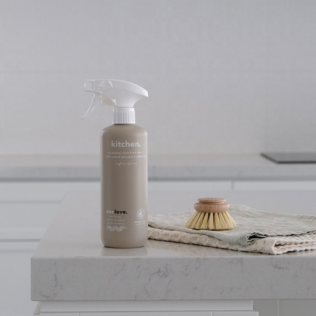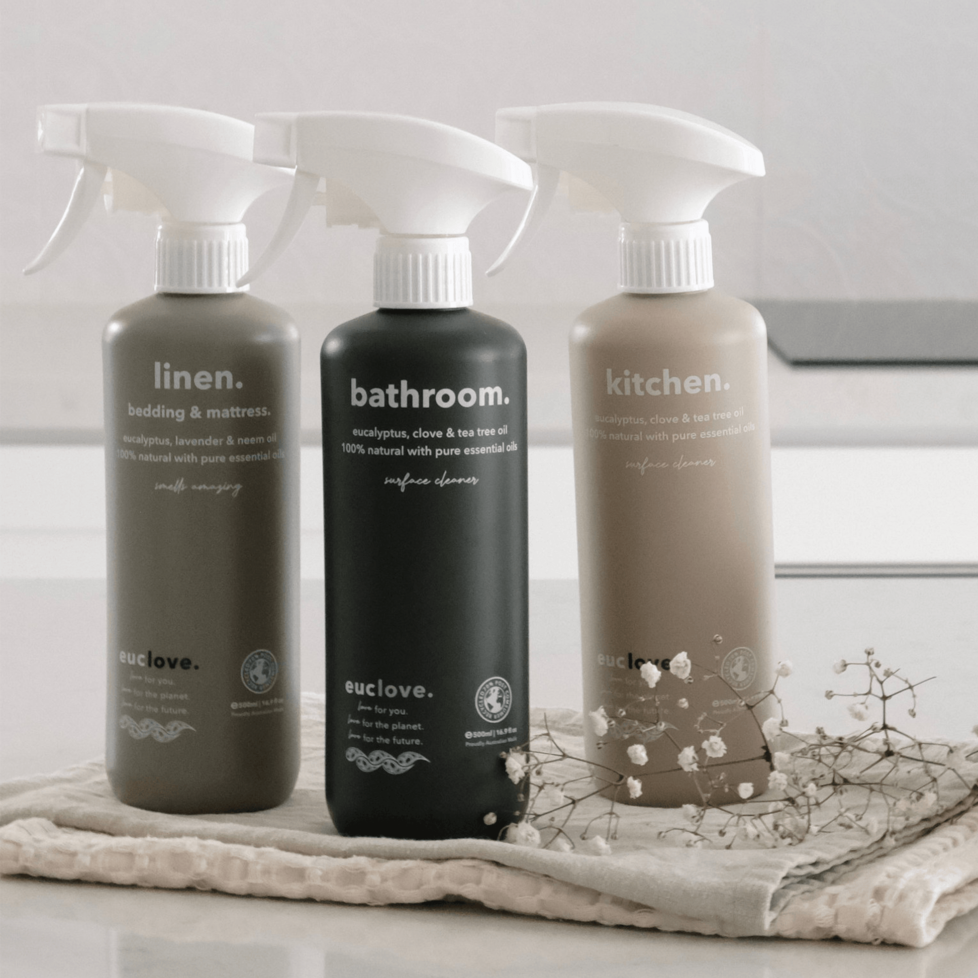 Kitchen Cleaner 500 ml, Bathroom Cleaner 500 ml, Linen Spray 500 ml.