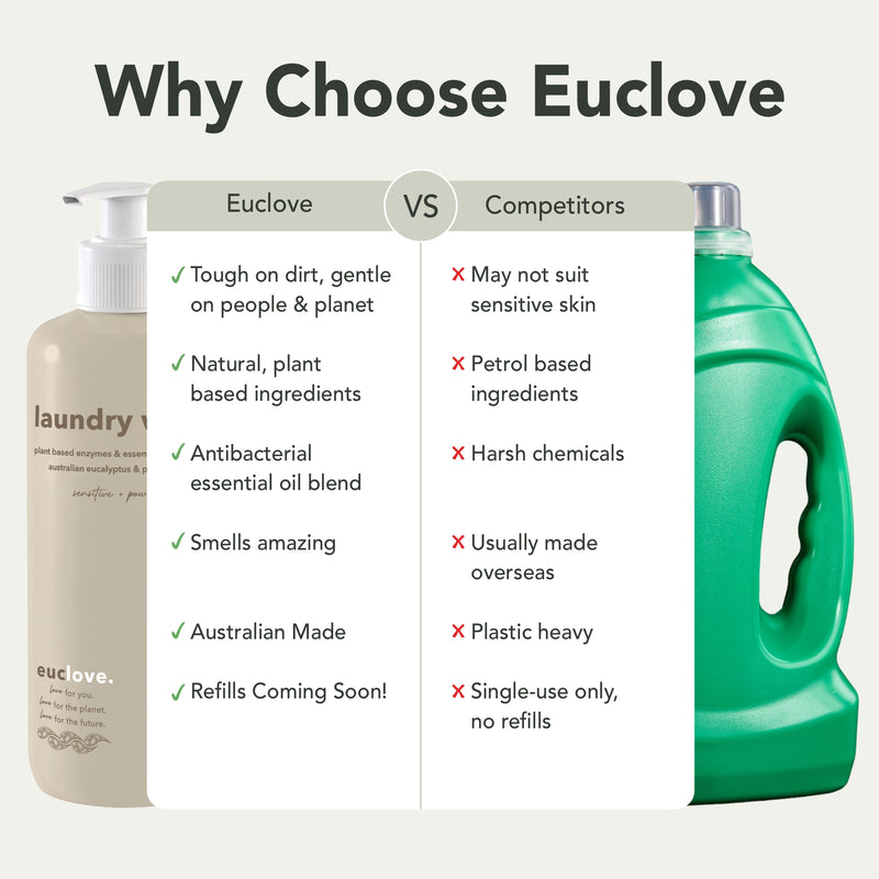 We asked ourselves – how do we formulate a laundry wash that performs as well as synthetic chemical- based detergents, while staying as safe for families and our planet? After a year of testing, we nailed a 2x formula that's tough on dirt, healthier for your family, better for our planet, and true to Euclove's promise of clean living for you, for the planet, for the future.