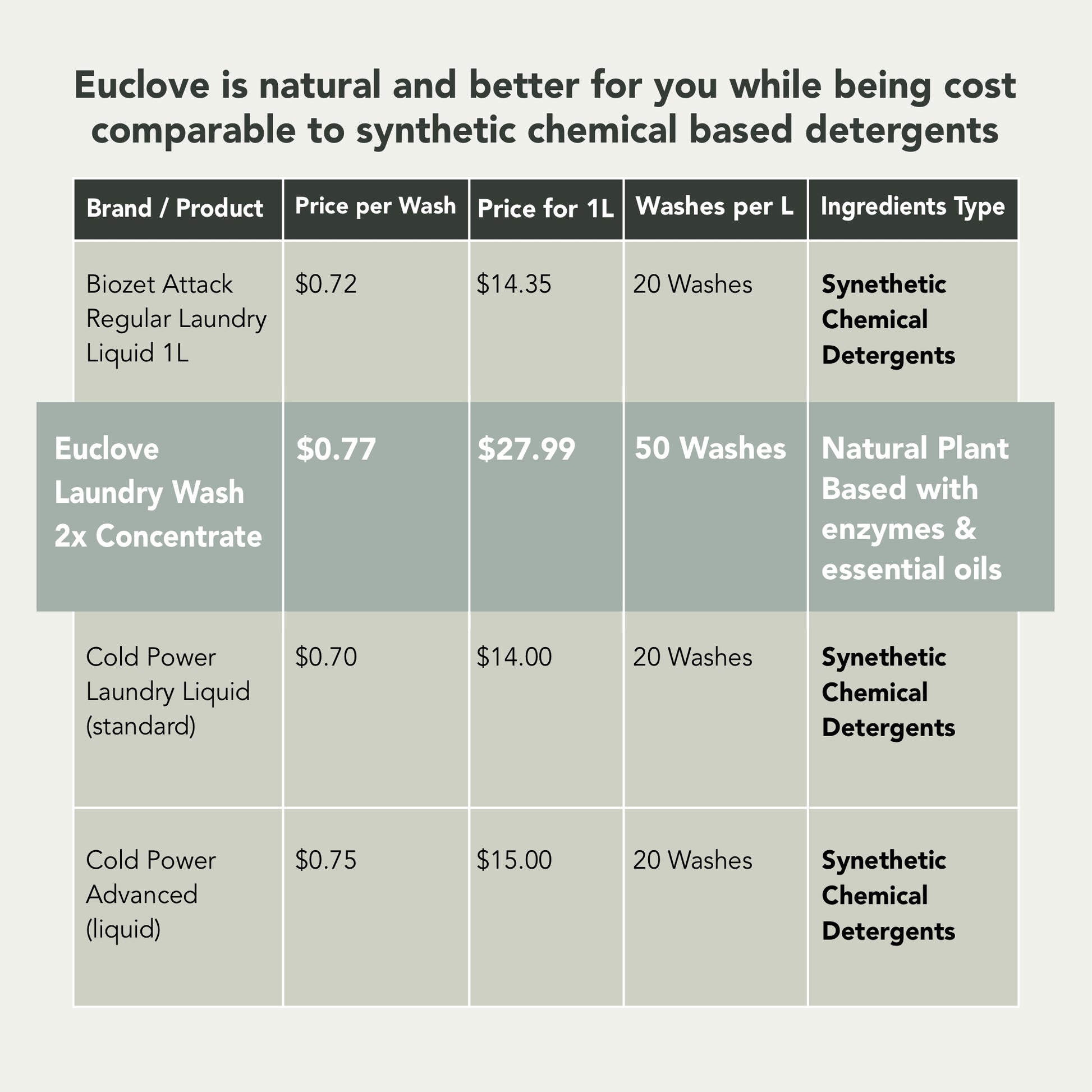 A: Euclove laundry wash costs $0.55 per load vs Omo or Dynamo which cost on average $0.73 at full price and $0.52 when on sale (calculated based on prices as of 31st Jan 2025 at major supermarkets).