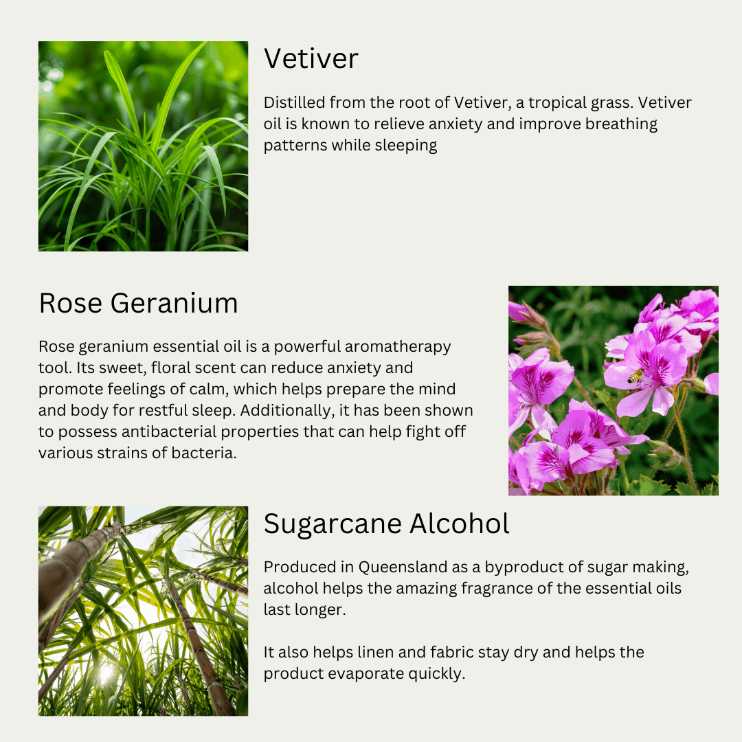 Pure essential oil blend of Rose Geranium, Himalayan Cedarwood and Indian Vetiver to help you relax and get a good night’s sleep.
